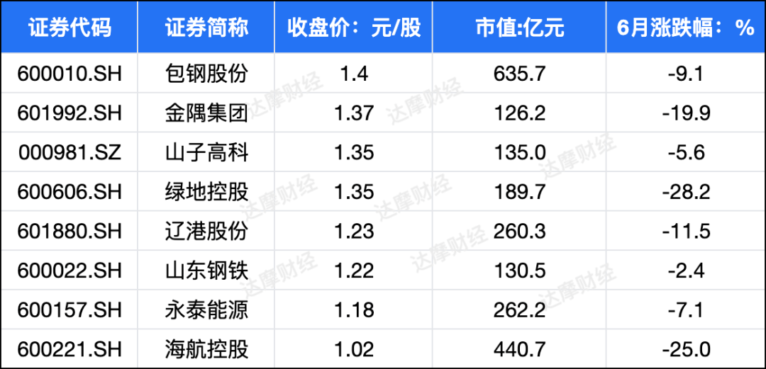 截至6月28日,股价低于1.5元的上市公司中非ST公司有8家市值都超过百亿,其中,最高跌幅的绿地控股在6月以来股价已经累计下跌28%。