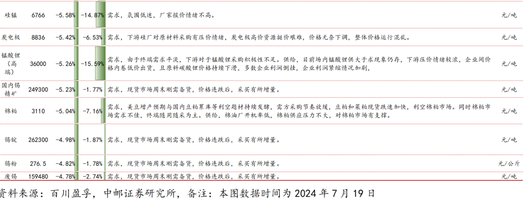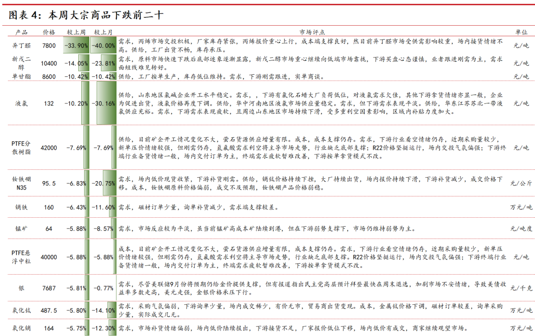本周大宗商品下跌前二十:异丁醛(-33.90%)、新戊二醇(-14.05%)、单甘酯(-10.42%)、液氯(-10.20%)、PTFE分散树脂(-7.69%)、钕铁硼N35(-6.83%)、镝铁(-6.43%)、锰矿(-5.88%)、PTFE悬浮中粒(-5.88%)、银(-5.81%)、氧化铽(-5.80%)、氧化镝(-5.75%)、硅锰(-5.58%)、炭电极(-5.42%)、锰酸锂(高端)(-5.26%)、国内锡精矿(-5.23%)、棉粕(-5.04%)、锡锭(-4.98%)、锡粉(-4.82%)、废锡(-4.78%)。