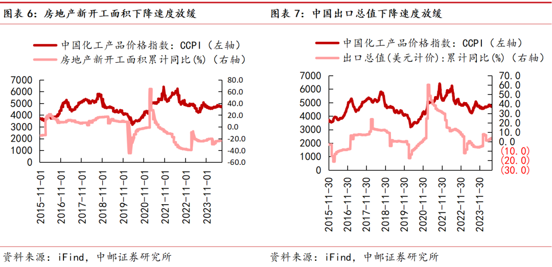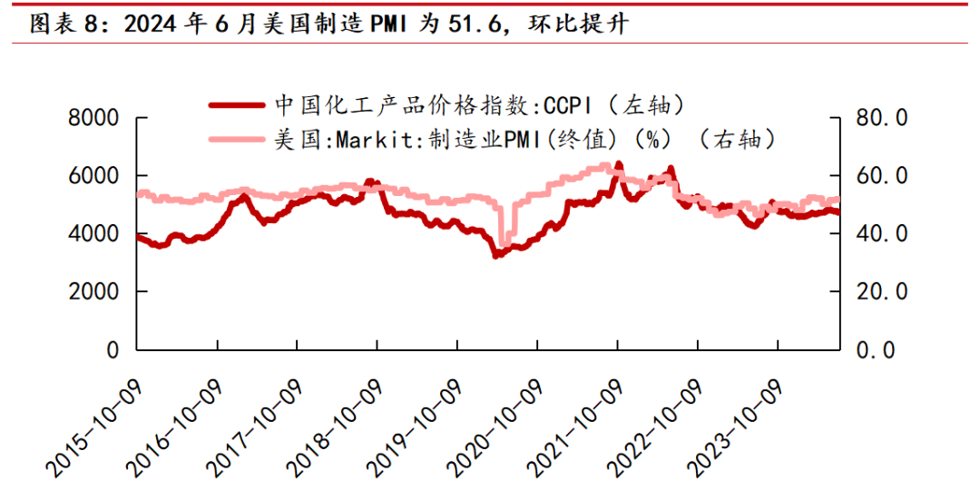 需求端,中国内外需有望改善。中国内外需求增速处于历史较低水平,2023年1月-12月,中国房地产累计新开工面积增速为-20.4%,2024年1-6月,中国房地产累计新开工面积增速为-23.7%;2023年1-12月,中国出口总值累计增速为-4.7%。2024年1-6月,中国出口总值累计增速为3.6%。我们预计伴随着国内房地产政策陆续出台、美国制造业PMI回升,中国内外需有望迎来改善。