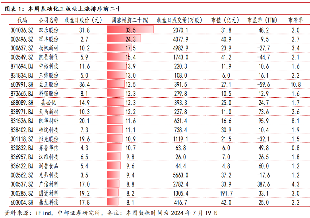 本周基础化工板块上涨排序前二十:双乐股份(33.47%)、辉丰股份(24.31%)、扬帆新材(17.46%)、凯美特气(15.37%)、中裕科技(13.95%)、三维股份(13.00%)、至正股份(12.52%)、科强股份(12.34%)、嘉必优(12.33%)、天马新材(12.20%)、凯华材料(11.62%)、硅烷科技(11.08%)、恒光股份(10.93%)、齐鲁华信(10.74%)、汉维科技(9.80%)、润普食品(9.55%)、兄弟科技(9.38%)、广信材料(8.79%)、国瓷材料(8.22%)、鼎龙科技(8.13%)。