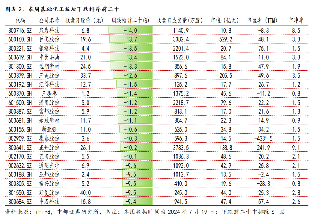 本周基础化工板块下跌排序前二十:泉为科技(-13.96%)、巨化股份(-13.73%)、银禧科技(-13.49%)、中曼石油(-13.43%)、远翔新材(-13.27%)、三美股份(-12.57%)、汇得科技(-11.47%)、三房巷(-11.36%)、通用股份(-11.17%)、富邦股份(-11.16%)、永冠新材(-11.05%)、新亚强(-10.62%)、集泰股份(-10.34%)、正丹股份(-10.20%)、芭田股份(-10.07%)、道明光学(-9.61%)、亚邦股份(-9.54%)、裕兴股份(-9.53%)、斯菱股份(-9.51%)、中石科技(-9.44%)。