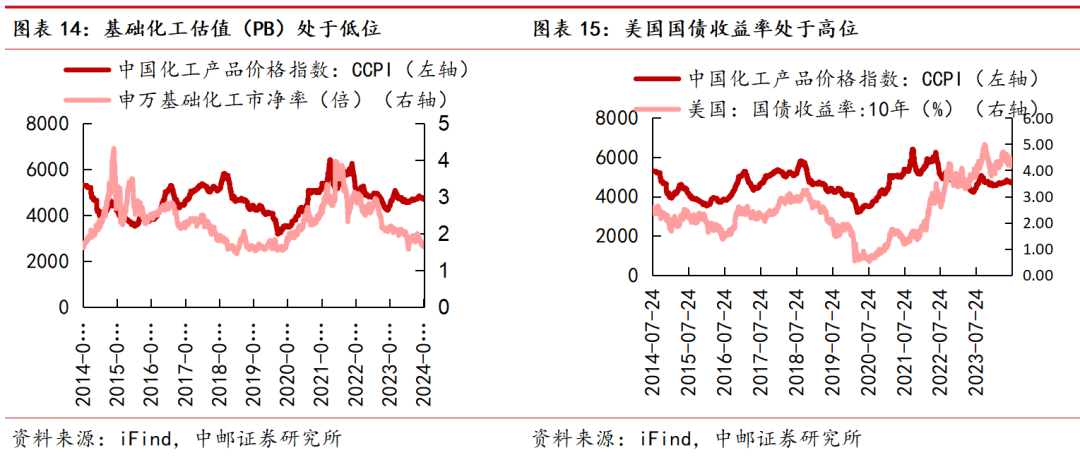 估值端,估值有望迎来提升。截止2024年7月19日,基础化工估值(PB)为1.68倍,处于2014年以来7.94%低分位,十年期美国国债收益率4.25%,处于2014年以来83.63%高分位,估值有望迎来提升。