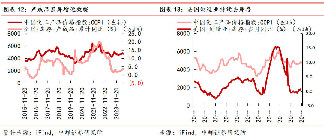 库存端,持续去库阶段。产成品库存累库增速放缓。2023年3月中国化工品库存增速达到近年高点,为10.7%。此后,行业主动去库存,累库速度放缓,2023年1-12月,中国产成品累计同比增速为2.1%。2024年1-6月,中国产成品累计同比增速为3.6%。美国制造业持续主动去库存。2022年5月美国制造业库存增速达到近年高点,为11.30%。此后,美国进入主动去库存阶段,2023年10月-2024年2月美国制造业库存连续五个月出现负增长,2024年4月美国制造业库存同比+0.3%。美国上一轮库存持续下降时间为2015年5月-2016年12月,连续17个月负增长。