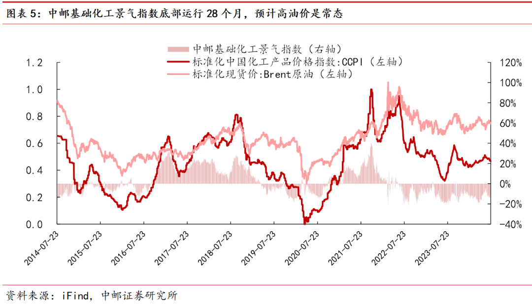 中邮证券基础化工景气指数底部运行约28个月。我们以Brent原油现货价格作为化工企业表示成本项,以中国化工品价格指数表示收入项,并将两种标准化处理,以两者差值表示化工企业盈利状况,命名为中邮证券基础化工指数。2020年3月—2021年10月基础化工盈利能力处于景气周期,持续时间约19个月,主因是内外需持续向好,叠加行业新增产能有限,行业进入主动补库存周期。2021年10月基础化工盈利出现向下拐点。2022年2月,受俄乌冲突等地缘政治因素影响,作为基础化工行业成本端的原油、煤炭等能源品供需偏紧。与此同时,基础化工行业受出口与内需增速放缓,行业开工率提升、资本开支转固等因素影响,供需偏于宽松,利润向产业链上游集中。此后,成本端供需偏紧,商品端供需宽松局面并未出现较大转变,基础化工行业盈利持续运行底部区间,运行时间约28个月。