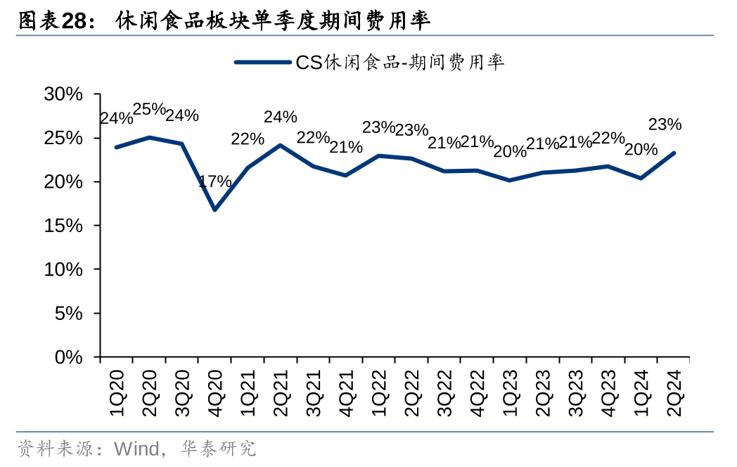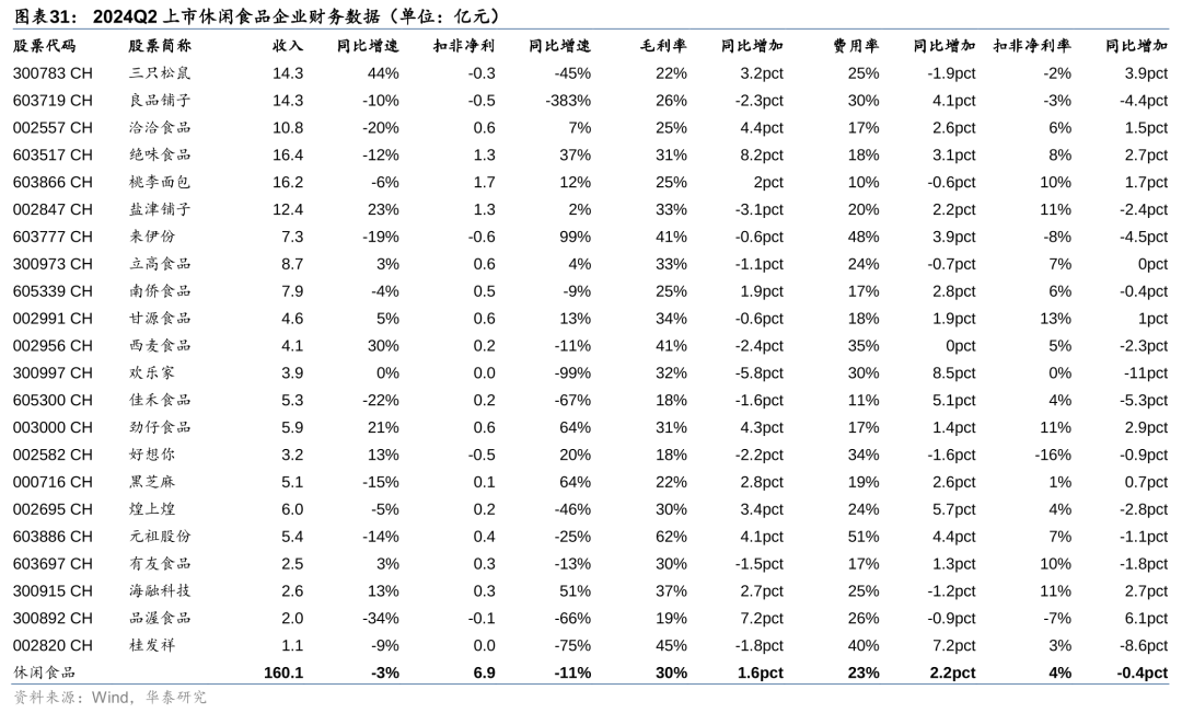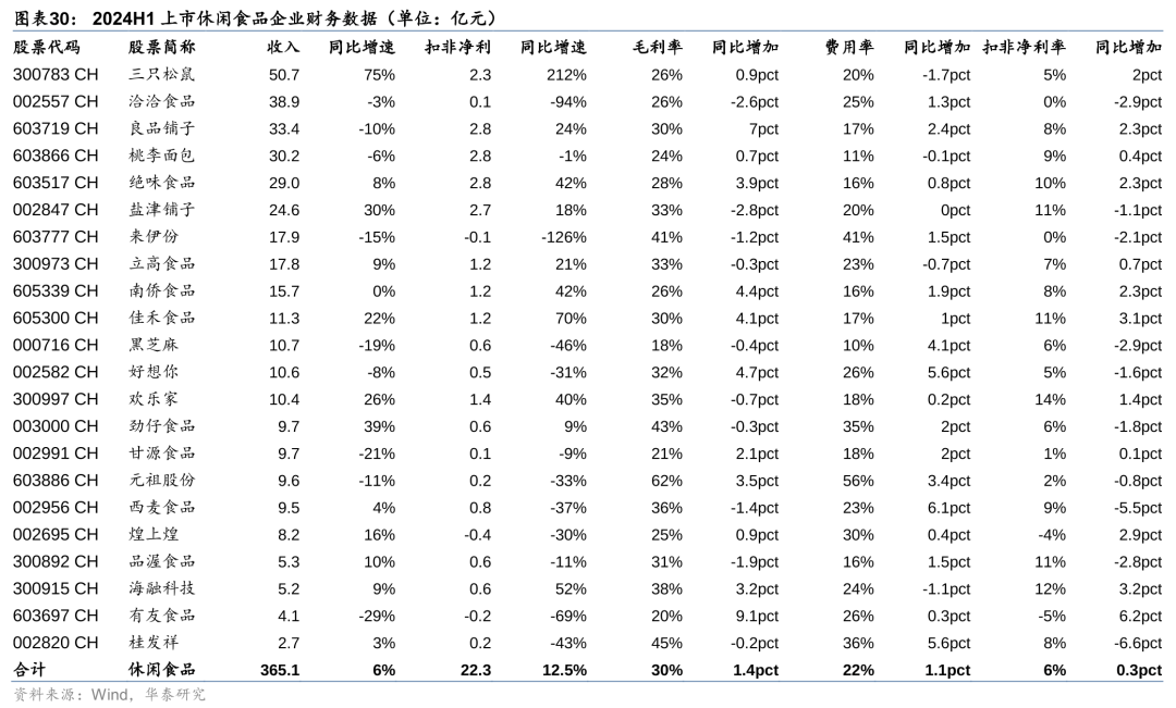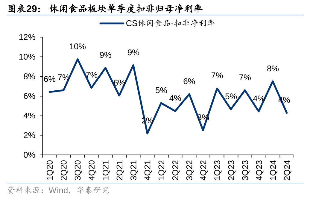 成本红利+规模效应释放带动24Q2休闲食品板块毛利率同比+1.6pct,费用增加致扣非净利率同比-0.4pct。24H1休闲食品板块毛利率30.1%,同比+1.4pct,主要系葵花籽等原材料成本改善,叠加规模效应的释放。24H1行业期间费用率为21.7%,同比+1.1pct,系龙头品牌及渠道推广费用有所增加;24H1休闲食品板块扣非净利率同比+0.3pct至6.1%。24Q2休闲食品板块毛利率29.5%,同比+1.6pct,成本改善持续显现,但规模效应有所减弱;期间费用率同比+2.2pct至23.3%,淡季聚焦产品/渠道调整,叠加规模效应走弱,费用显著增加,最终扣非净利率同比-0.4pct至4.3%。
