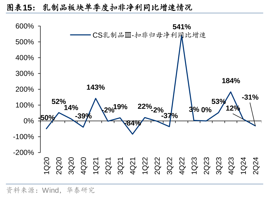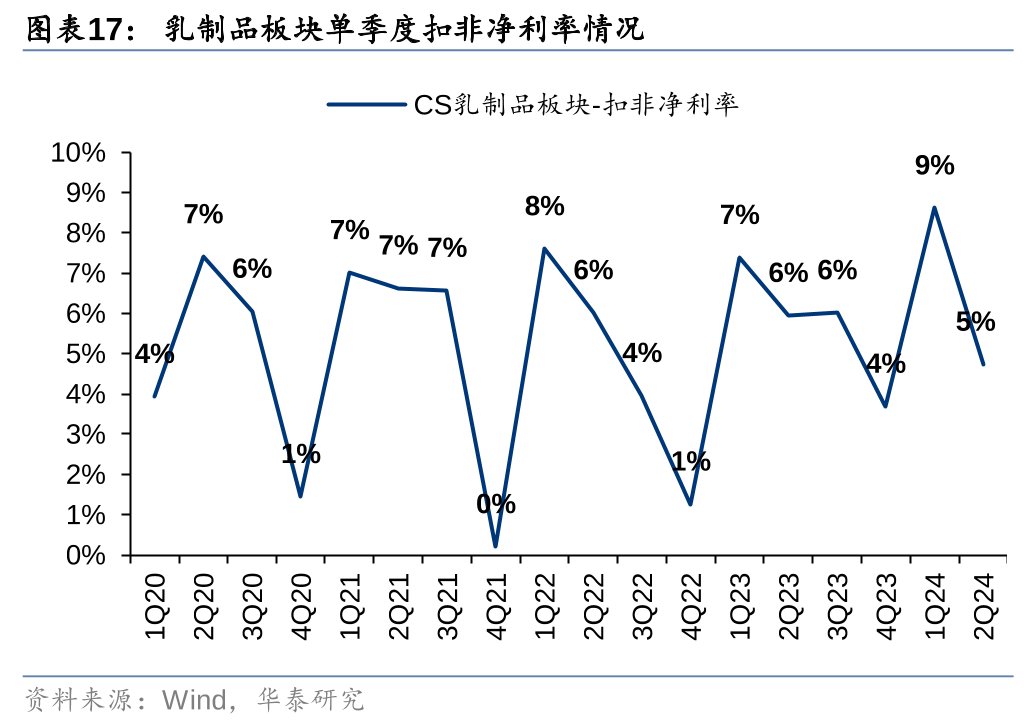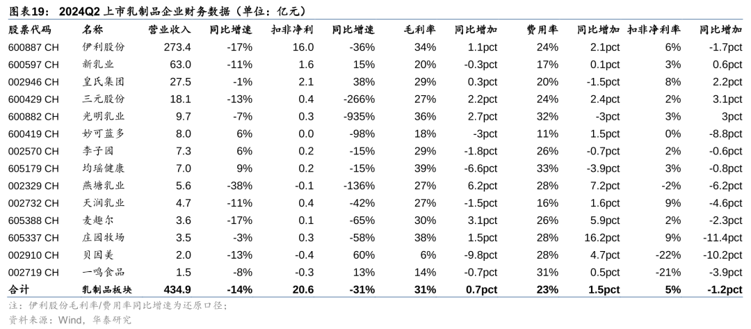 利润端,成本利好与促销压力并存、喷粉减值等因素扰动下板块Q2利润率有所下行,关注后续原奶供需关系及行业竞争态势的走势。奶价下行带来的成本利好及乳企产品结构的持续优化(高毛利的奶粉业务环比改善、高端奶表现普遍优于基础白奶)对毛利率提供正向贡献,24H1/24Q2乳制品板块毛利率同比+1.2/+0.7pct。费用端看,24年以来乳企费效管控力度持续提升,但由于24Q2淡季需求较弱,乳企主动对大日期产品进行库存消化等工作、使部分产品的折扣促销力度加大,24Q2期间费用率同比+1.5pct至23.2%。综合影响下,24Q2乳制品板块毛销差同比-1.5pct,盈利能力短期承压。此外,喷粉减值/信用减值(伊利为上游提供贷款计提坏账比例增加)对于乳企净利润造成扰动。最终24Q2乳制品板块扣非净利率同比-1.2pct至4.7%。