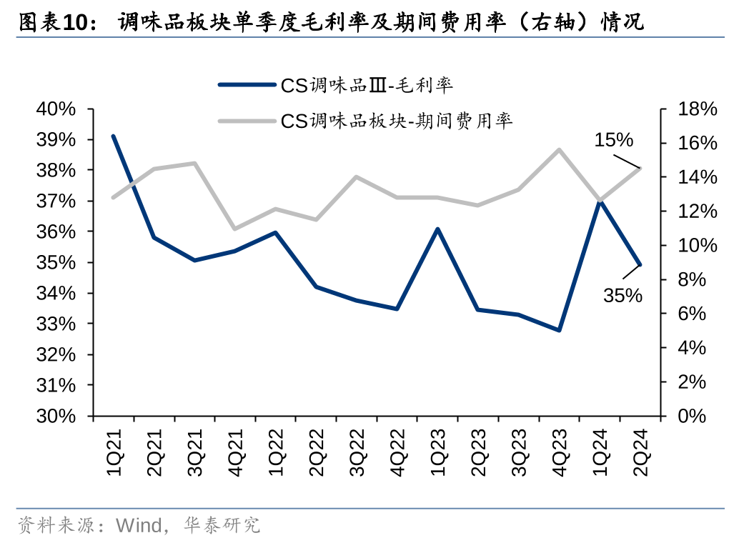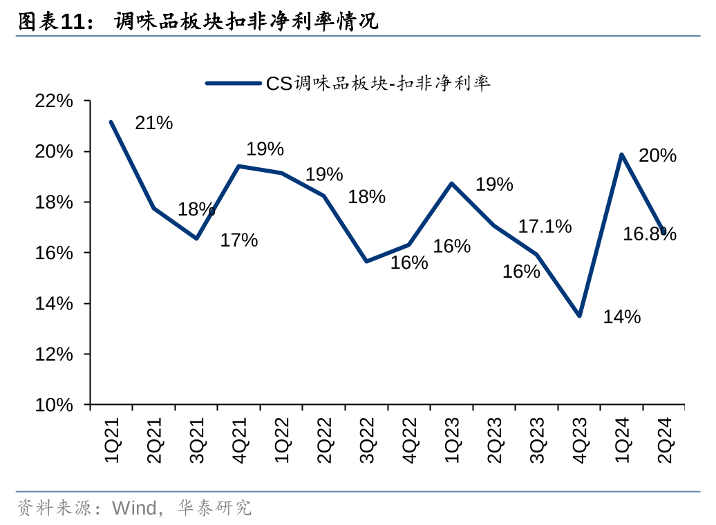 成本红利带动毛利率向上,存量竞争下龙头费用投放增加。24H1调味品板块毛利率36.1%,同比+1.2pct,大豆等原材料价格下降在报表端有所兑现,海天味业/中炬高新毛利率同比+1.0/+4.7pct,千禾味业部分材料采购为阶梯定价、在规模效应减弱影响的背景下毛利率同比-2.7pct。24H1年调味品板块期间费用率13%,同比+0.9pct,系行业存量竞争叠加龙头渠道变革导致费用投放增加;最终板块扣非净利率同比+0.5pct至18%,盈利能力有所提升。24Q2调味品板块毛利率34.9%,同比+1.5pct,大豆/包材等核心原材料价格回落,持续驱动盈利能力上行;期间费用率14.5%,同比+2.2pct,费用增投显著,最终24Q2录得扣非净利率16.8%,同比-0.3pct。