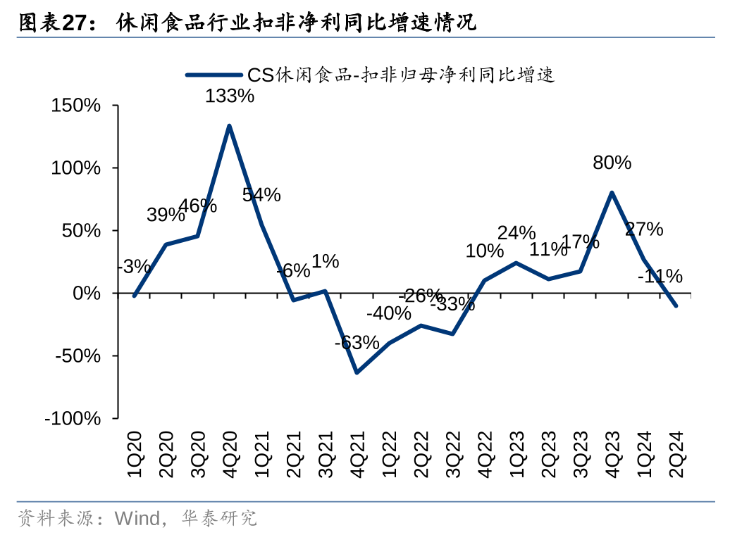 休闲零食板块Q2淡季整体平淡。24H1休闲食品板块实现营收/归母净利润/扣非净利365.1/25.8/22.3亿元,同比+6.5%/+6.7%/+12.5%;其中24Q2营收/归母/扣非净利160.1/8.5/6.9亿元,同比-2.9% /-10.6%/-10.5%。24Q2经营淡季,收入端因渠道库存清理、渠道战略调整等因素增长环比降速,利润端有所分化,整体看费投增加抵消部分成本红利。