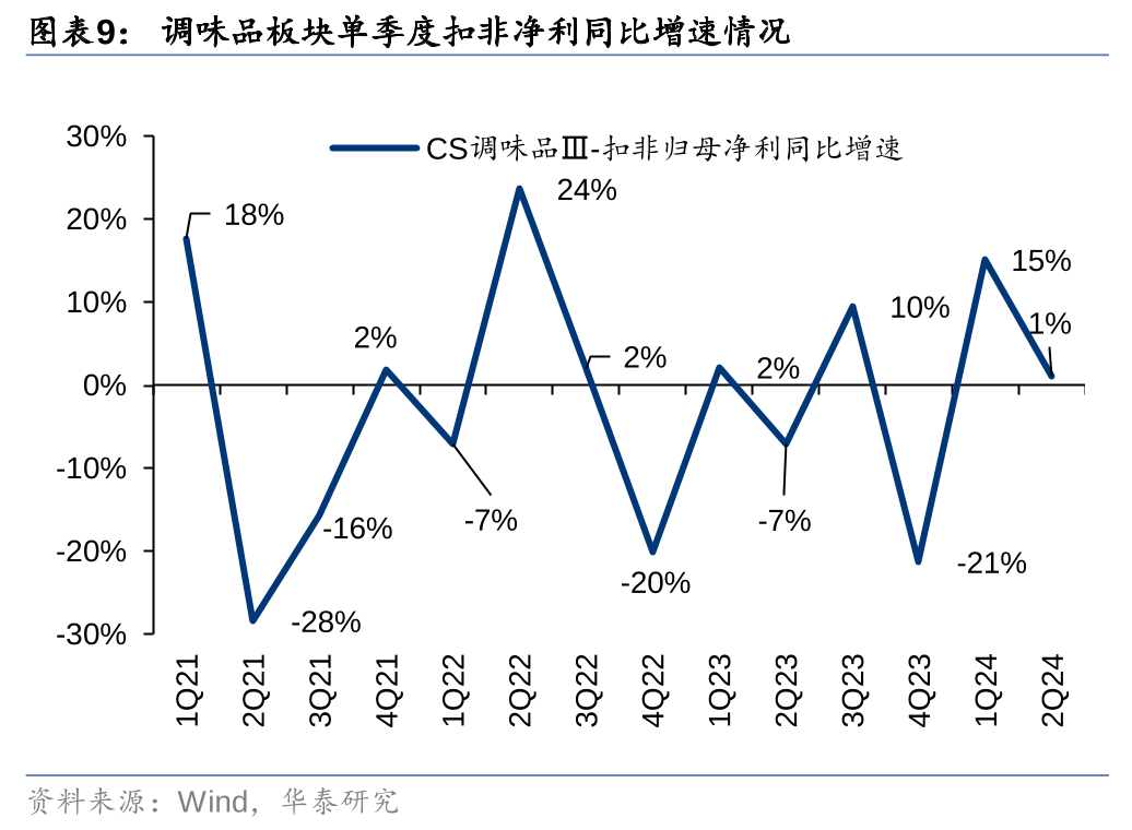 CS调味品板块24Q2营收/归母/扣非净利123.4/21.7/20.7亿元,同比+2.9%/+388.0%/+1.1%。Q2下游需求偏淡,存量竞争下龙头多聚焦自身产品/渠道变革,进展有所分化,其中海天23年去库后轻装上阵,当前强化终端精细化管理;中炬Q2改革较为激进导致短期承压;千禾Q2控货储备产品升级、报表端亦有所承压。利润端,Q2大豆、包材等成本下降成果持续体现,但存量竞争与改革期间费效比有所下降,最终扣非净利率同比-0.3pct。