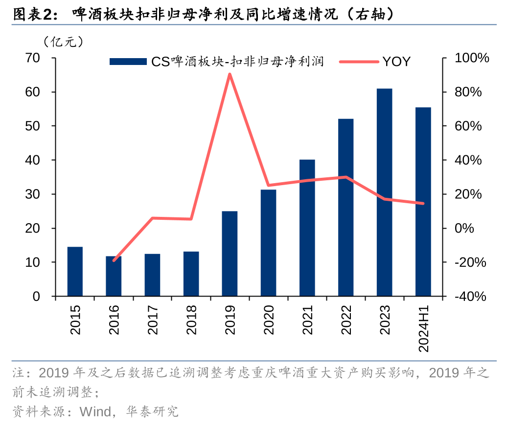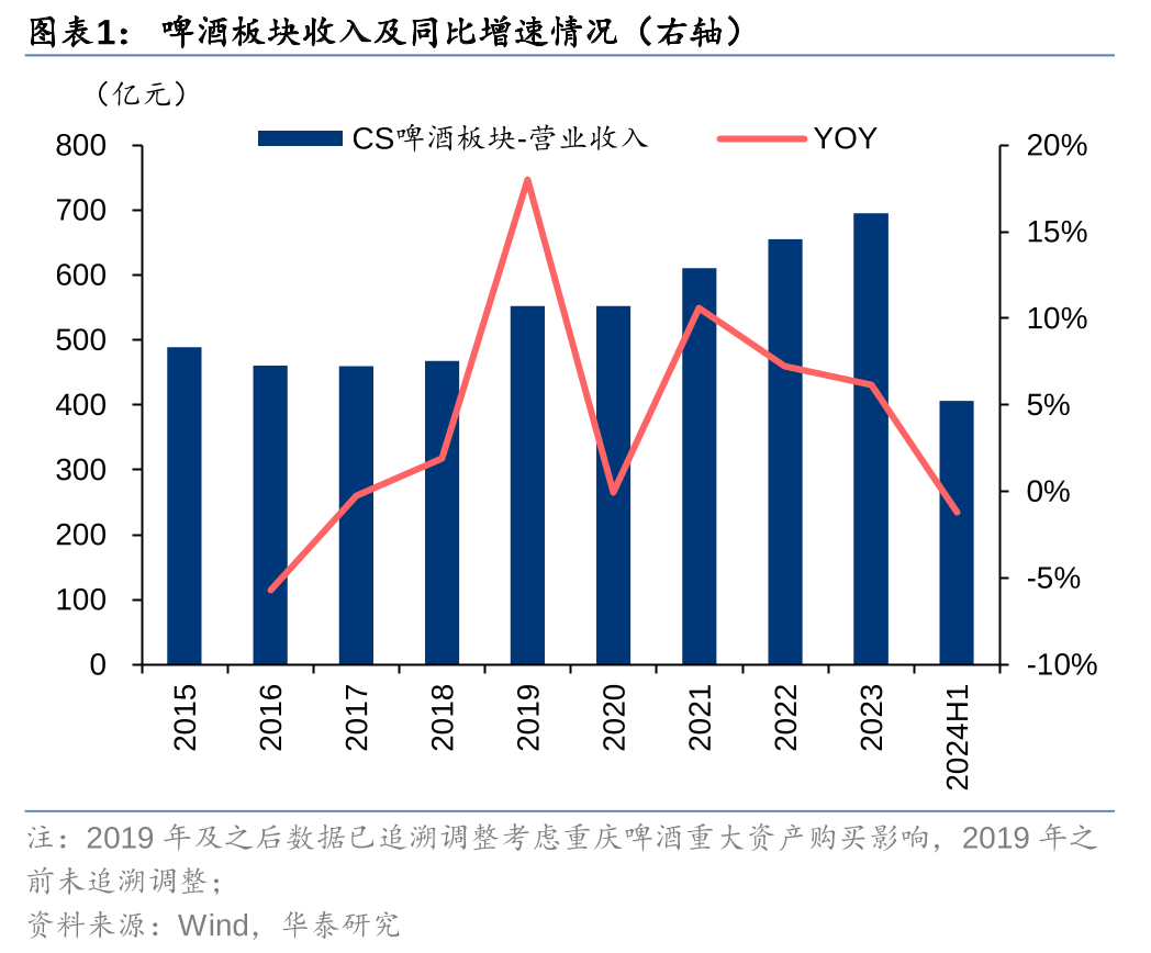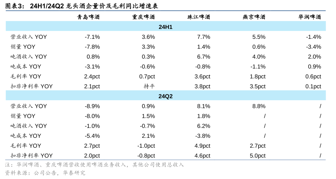 24H1需求弱复苏、升级表现分化。2024H1啤酒板块(中信,下同)营收/归母/扣非净利406.2/58.3/55.4亿元,同比-1.2%/+12.8%/+14.4%。24Q2营收/归母净利/扣非净利211.9/35.6/33.8亿元,同比-1.6%/+10.7%/+12.2%。Q2行业需求延续弱复苏,叠加5-6月南方地区强降雨天气影响,行业销量整体平淡,龙头因基数差异表现分化(2024H1华润啤酒/青岛啤酒/重庆啤酒/燕京啤酒/珠江啤酒销量同比-3.4%/-7.8%/+3.3%/+0.6%/+1.4%);结构端,H1延续价增趋势、但增速环比23FY有所放缓,Q2升级延续走弱、部分龙头ASP下滑,在基地市场内结构偏低的部分企业依靠大单品放量取得量价较好增长。