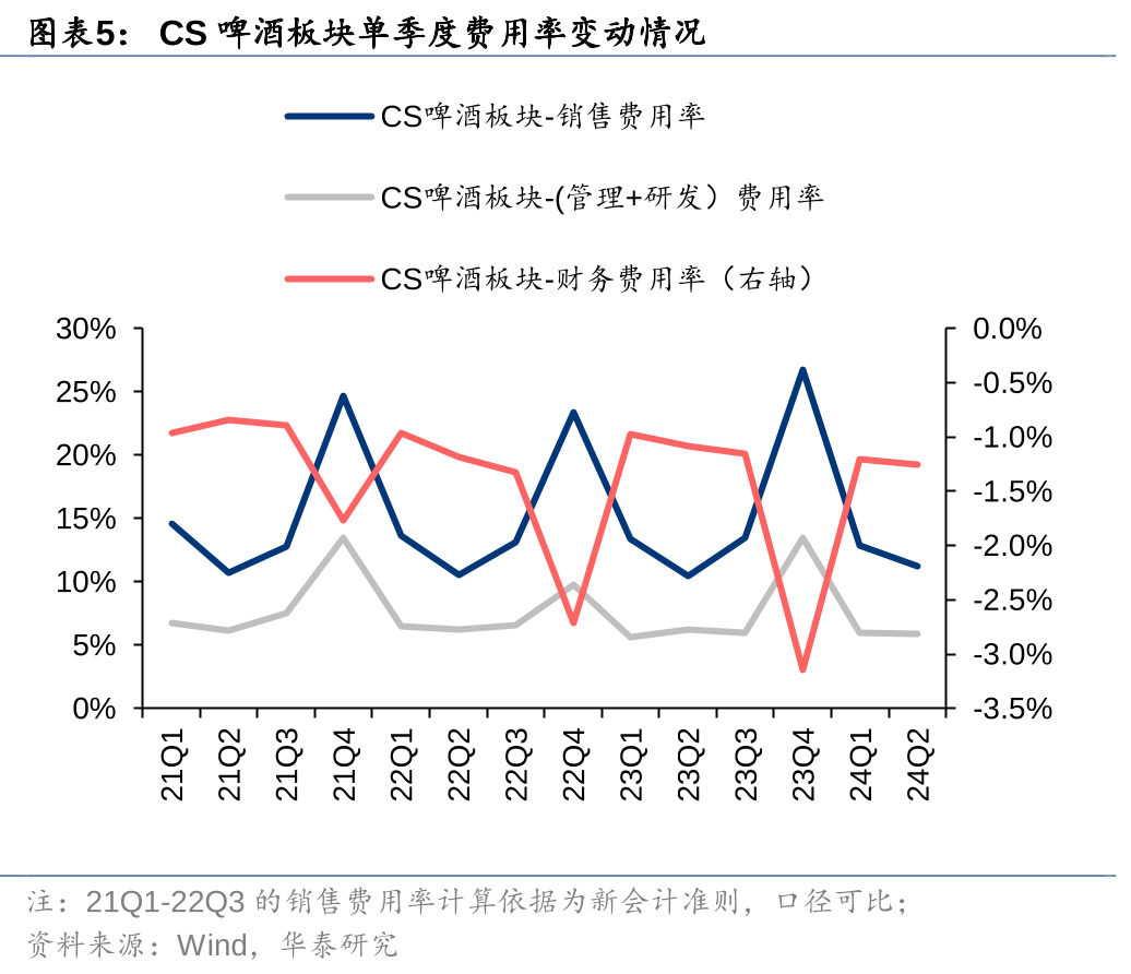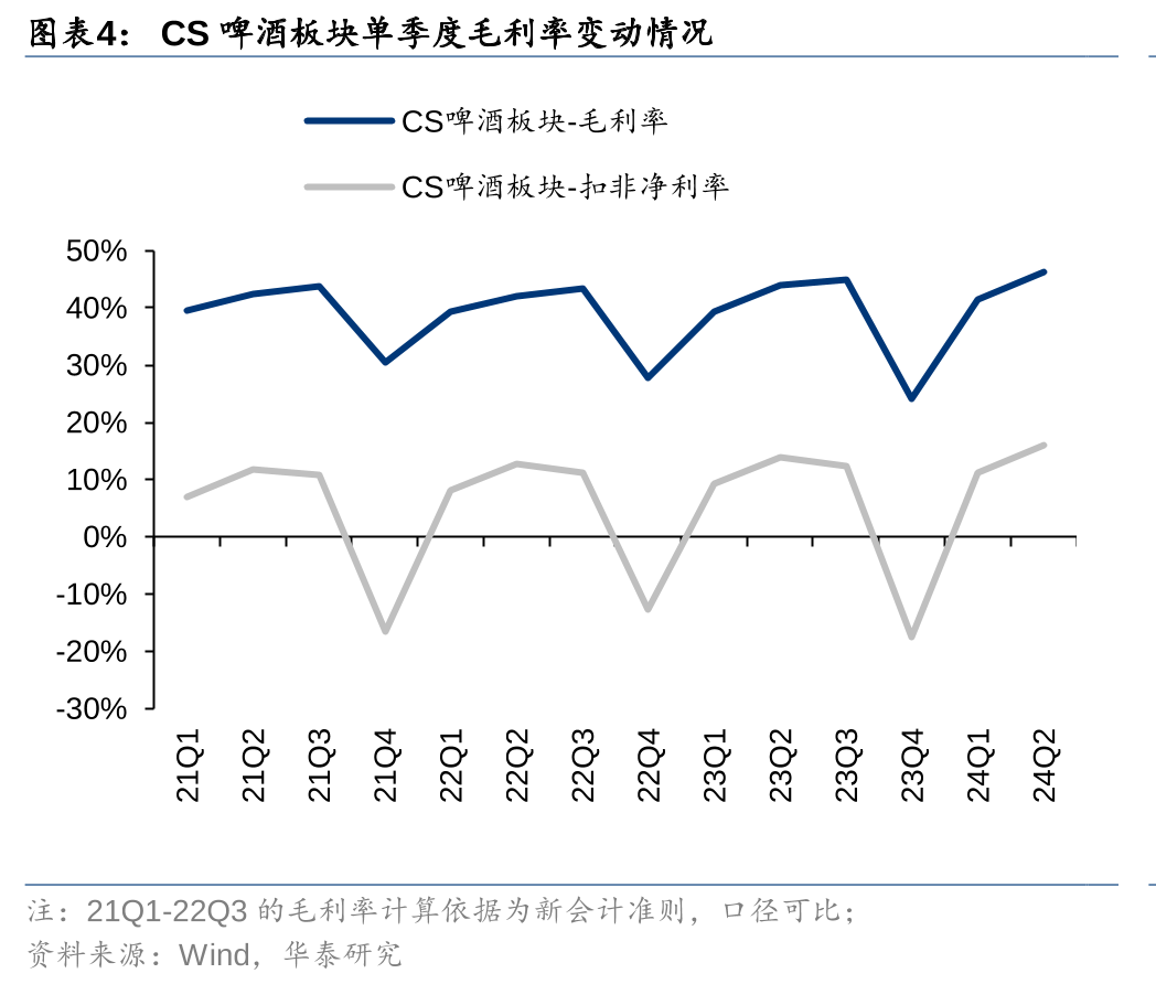 费用率:旺季前费率短期提升。2024H1年啤酒板块销售费用率同比+0.1pct至12.0%(24Q2同比+0.7pct至11.2%),上半年下游需求整体平淡,龙头份额诉求提升,叠加Q2体育营销及旺季备货等费投较多,销售费用率整体有所提升;综合管理/研发/财务费用看,2024H1啤酒板块期间费用率同比-0.1pct至16.7%(24Q2同比+0.2pct至15.8%),龙头持续进行内部提效。最终24H1啤酒板块录得扣非净利率13.7%,同比+1.9pct,Q2录得扣非净利率16.0%,同比+2.0pct。