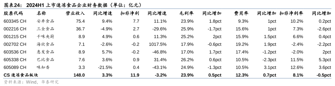 24Q2成本压力延续缓和,行业价格竞争加剧、致部分产品的折扣促销力度加大,板块扣非净利率下滑。24年以来,速冻企业成本压力处于整体可控状态,龙头企业对于成本的掌控能力较强,24H1速冻食品板块整体毛利率同比+0.5pct至23.9%;其中24Q2毛利率同比+0.5pct至22.1%。费用端看,在需求整体平淡的背景下,部分产品价格竞争加剧,厂家给予一定的折扣促销力度,24H1期间费用率同比+0.7pct至12.3%,其中24Q2期间费用率同比+1.4pct至11.8%。最终24H1速冻食品板块整体扣非净利率同比-0.5pct至8.1%,其中24Q2扣非净利率同比-1.1pct至7.0%。