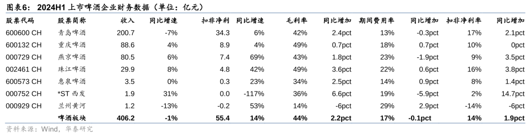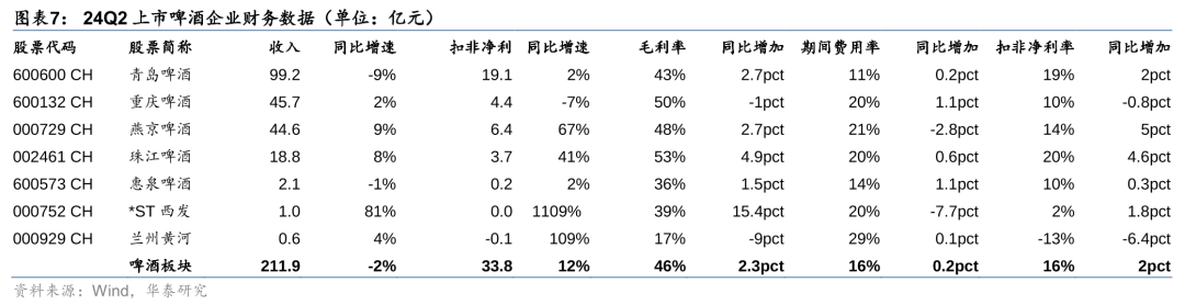 CS啤酒板块24Q2营收/归母/扣非净利211.9/35.6/33.8亿元,同比-1.6%/ +10.7%/+12.2%。Q2需求偏弱/雨水干扰/高基数等因素导致销量整体承压,H1延续价增趋势、但增速环比23FY有所放缓,Q2升级延续走弱、部分龙头ASP下滑,在基地市场内结构偏低的部分企业依靠大单品放量取得量价较好增长;利润端,Q2成本红利凸显、旺季前费用整体有所增加,Q2板块扣非净利率仍同比+2.0pct。