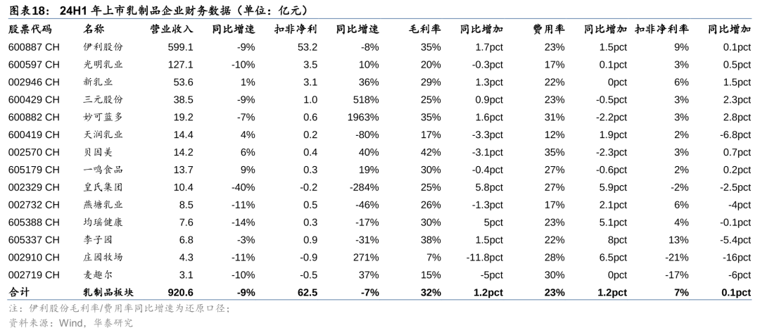 24Q2龙头乳企聚焦渠道调整,经营短期承压,期待后续改善。24H1乳制品板块实现营收/归母净利/扣非净利920.6/84.0/62.5亿元,同比-8.9%/+8.3%/-7.3%;对应24Q2乳制品板块实现营收/归母净利/扣非净利434.9/20.3/20.6亿元,同比-13.8%/-44.0%/-31.3%。销量上看,春节后整体乳制品需求回落,终端及渠道库存压力凸显;价格上看,原奶供给过剩的态势仍有延续,原奶价格持续下行,部分促销活动亦对产品价盘产生扰动。龙头乳企24Q2着力清理渠道库存、积极调整发货节奏、重塑渠道价值链,短期经营虽然承压,但积极调整后有望轻装上阵,期待后续改善。伊利股份24Q2实现营收/归母净利272.3/16.1亿元,同比-16.6%/-40.2%;蒙牛乳业24H1实现营收/归母净利446.7/24.5亿元,同比-12.6%/-19.0%。收入端,两家公司的液奶业务均有承压,春节后两家公司均调整经营节奏、进行渠道库存管控,截至 24Q2末、库存已基本恢复良性;冰品业务由于天气因素、叠加渠道去库存的影响,24Q2伊利的冰品业务收入-44.3%,24H1蒙牛的冰品业务收入-21.8%。利润端,原奶价格延续下滑态势,两家公司均在合理范围内加大对大日期产品的促销力度,叠加计提喷粉等减值损失,使得利润端下滑幅度较大。