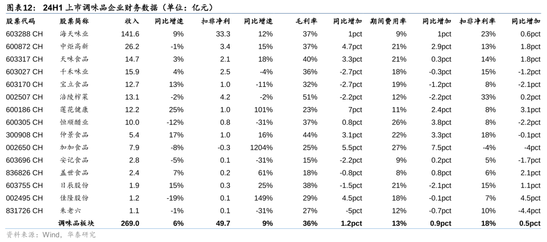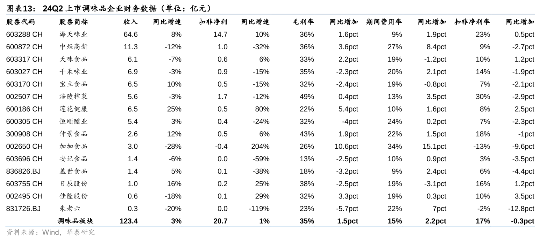 收入稳健增长、成本下行驱动盈利改善。2024H1调味品板块营收/归母/扣非净利269.0/52.0/49.7亿元,同比+5.9%/+67.9%/+8.8%;其中24Q2营收/归母/扣非净利123.4/21.7/20.7亿元,同比+2.9%/+388.0%/+1.1%(非经常收益主要来自于中炬24H1预提诉讼导致的或有负债)。24H1行业整体需求平淡、存量竞争显著,龙头积极进行产品/渠道调整,谋求alpha增长,但进度与成果有所分化:海天味业Q2收入/归母净利同比+8.0%/+11.1%;中炬高新Q2收入/扣非归母净利同比-12.0%/-32.4%;千禾味业Q2收入/归母净利同比-2.5%/-14.2%。