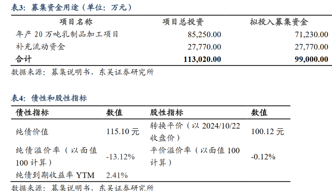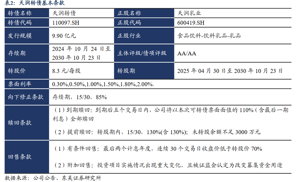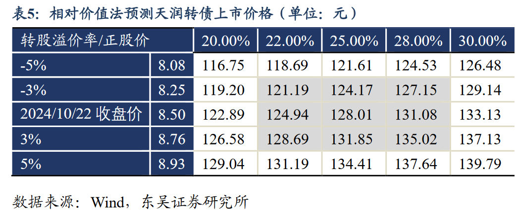 我们预计天润转债上市首日价格在121.19~135.02元之间。按天润乳业2024年10月22日收盘价测算,当前转换平价为102.41元。