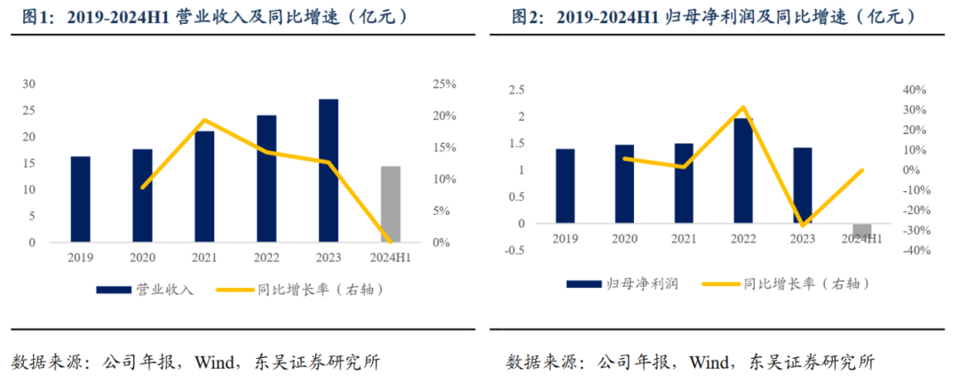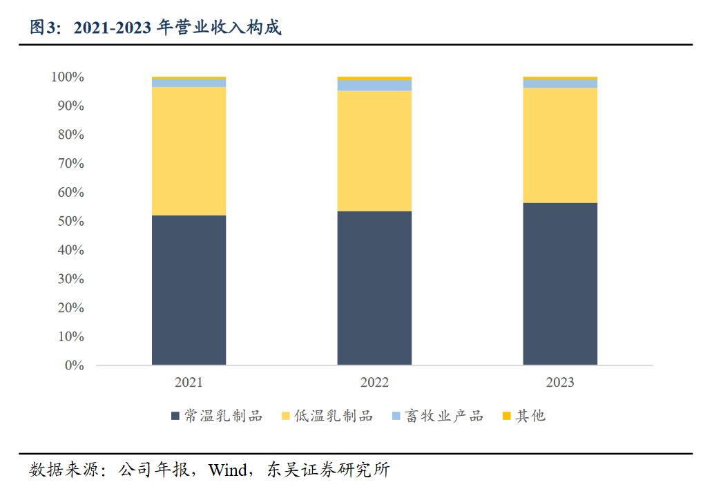 2019年以来公司营收稳步增长,2019-2023年复合增速为13.65%。自2019年以来,公司营业收入总体呈现稳步增长态势,同比增长率“V型”波动,2019-2023年复合增速为13.65%。2023年,公司实现营业收入27.14亿元,同比增加12.62%。与此同时,归母净利润也不断浮动,2019-2023年复合增速为0.44%。2023年实现归母净利润1.42亿元,同比减少27.74%。截至最新报告期(2024/06/30),2024年H1,天润乳业的营业收入和归母净利润规模分别达到14.43亿元、-0.28亿元。