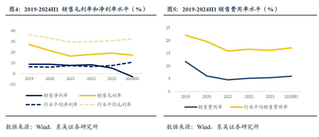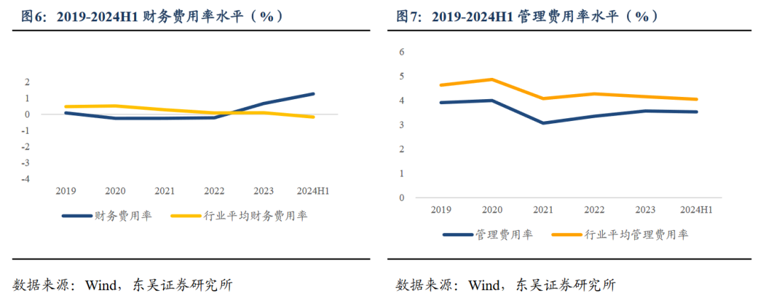 注:图4-7中的行业平均线,均是通过计算申万二级行业指数的各项费用和主营收入的比值,得到相应的费用率,而不是单个公司的相应费用率的加权平均,这种计算方法在行业集中度比较高的时候,可能会突出主营收入较大的公司的影响,弱化主营收入较小的公司的影响。