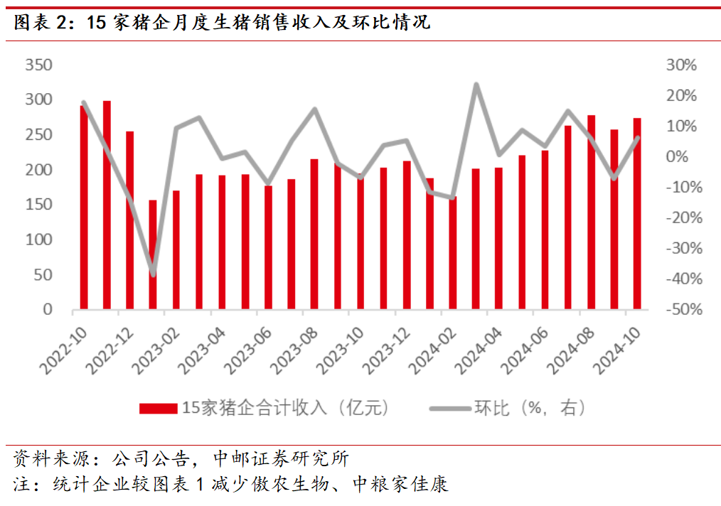 17家上市公司中,有15家披露了销售收入情况,10月合计为273.96亿元,环比9月增6.20%,同比增长40.18%。前10个月,上市公司总收入为2275.31亿,同比增长20.49%。10月猪价下行,出栏量增加,带动收入增长。