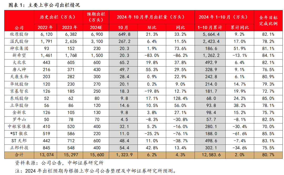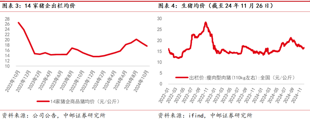 1)量:顺势出栏。17家上市猪企合计出栏生猪1323.9万头,环比9月增加6.2%,同比增加4.3%。前10个月,17家上市公司累计出栏1.26亿头生猪,累计同比增长2.0%。10月以后猪价下跌,出栏有所加速。当前17家上市公司合计完成了出栏预期的80.7%。行业对市场预期谨慎、产能增长缓慢,三季报后,部分公司再度下调出栏目标;24年上市公司端生猪出栏仅微增。