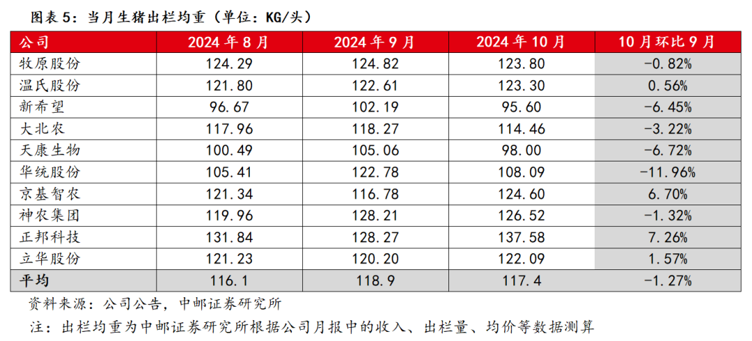 3)体重:先增后降。10家上市公司出栏均重为117.4公斤/头,环比降1.27%。中上旬市场出栏节奏正常,但气温下降后的猪只增重速度提升,故出栏均重上升。下旬,市场对于后市行情看弱,集团降重出栏预期增强,带动出栏体重下降。