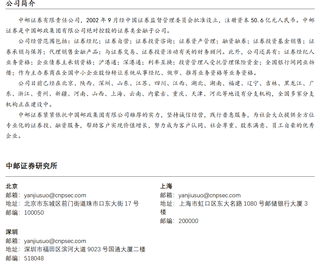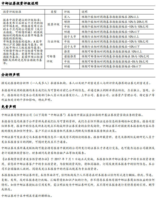 本订阅号所载内容所指的证券或金融工具的价格、价值及收入可涨可跌,以往的表现不应作为日后表现的显示及担保。本订阅号所载内容并非投资决策服务,仅供订阅人参考之用,不是也不应被视为出售、购买或认购证券或其它金融工具的要约或要约邀请。订阅人不应单纯依靠本订阅号所载内容而取代自身的独立判断,应根据自身能力自主审慎决策,并自行承担投资风险。本订阅号所载内容不表明其对产品或者服务的风险和收益做出实质性判断或者保证,中邮证券不对使用本订阅号所载内容产生的任何直接或间接损失或与此有关的其他损失承担任何责任。