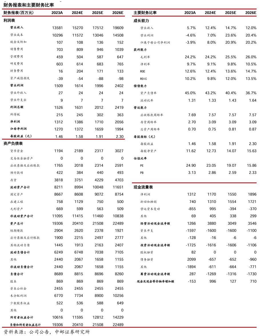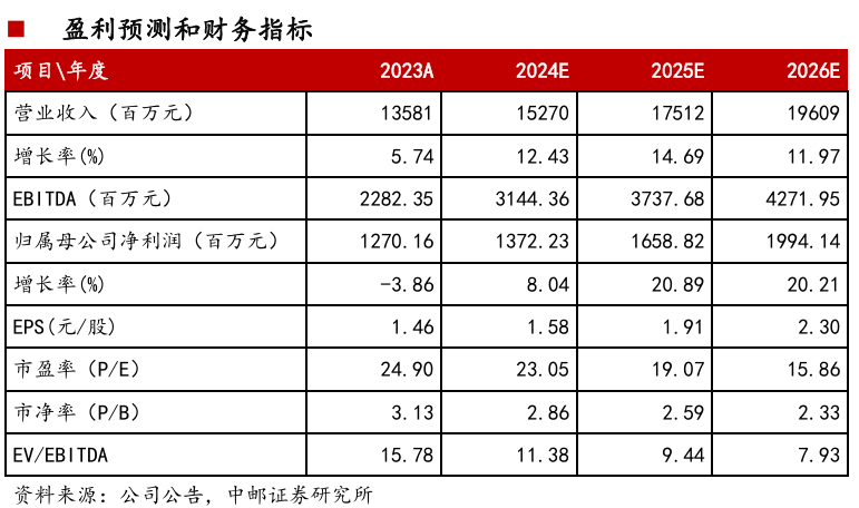 我们预计公司2024年-2026年营业收入分别为152.70/175.12/196.09亿元,同比+12.43%/+14.69%/+11.97%,预计2024年-2026年归母净利润分别为13.72/16.59/19.94亿元,同比+8.04%/+20.89%/+20.21%。未来三年EPS分别为1.58/1.91/2.30元,对应当前股价PE为23/19/16倍,维持“买入”评级。