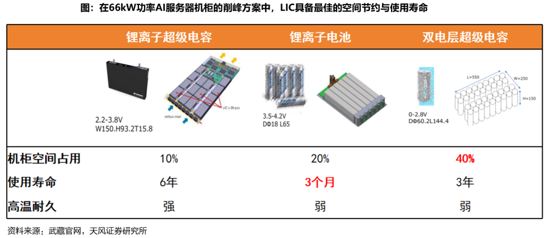 锂离子超级电容技术(LIC)具备“空间节约+使用寿命”独特优势,是AIDC削峰元器件最现实的选择。