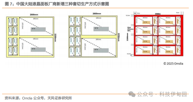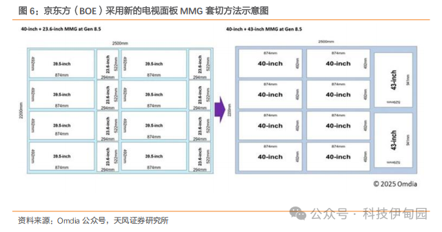 8.5代和8.6代产线生产更多液晶电视面板:京东方决定在其福清B10 8.5代产线采用新的MMG套切方法。新的MMG套切将包括八片40英寸电视面板和两片43英寸电视面板。中国大陆液晶面板厂商还可能增加三种套切生产方式,以提高43英寸和85英寸面板的生产量。除了生产85英寸面板外,中国大陆液晶面板厂商还将在其8.5代和8.6代产线生产更多超大尺寸面板。