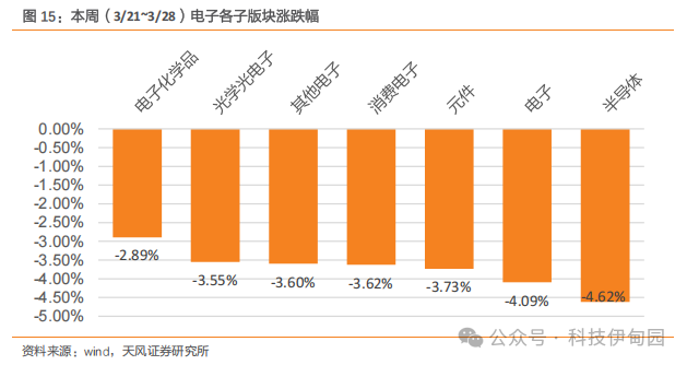电子板块细分行业主要呈下跌趋势。元件/半导体/电子/电子化学品/其他电子/消费电子/光学光电子本周涨跌幅分别为-3.73%/-4.62%/-4.09%/-2.89%/-3.60%/-3.62%/-3.55%。