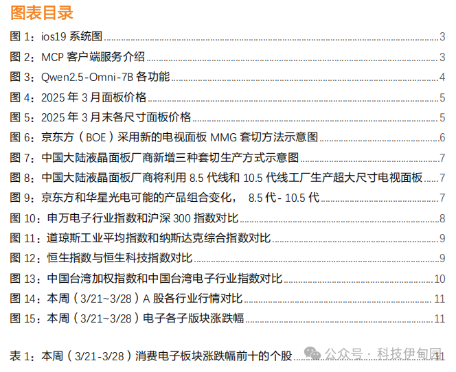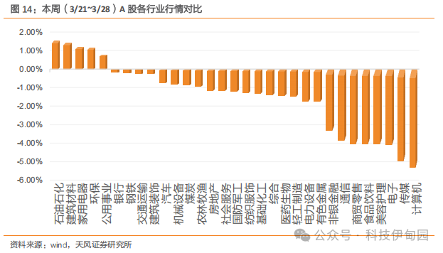 3月28日美股道琼斯工业平均指数为41583.9,本周(3/21~3/28)跌幅为0.96%,3月28日纳斯达克综合指数为17322.99,本周(3/21-3/28)跌幅为2.59%。3月28日恒生指数为23426.6,本周(3/21~3/28)跌幅为1.11%,3月28日恒生科技指数为5506.47,本周(3/21~3/28)跌幅为2.36%,3月28日中国台湾加权指数为21602.89,本周(3/21~3/28)跌幅为2.73%,3月28日中国台湾电子行业指数为1163.45,本周(3/21~3/28)跌幅为3.06%。