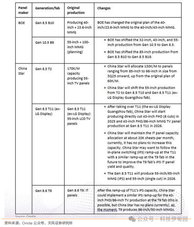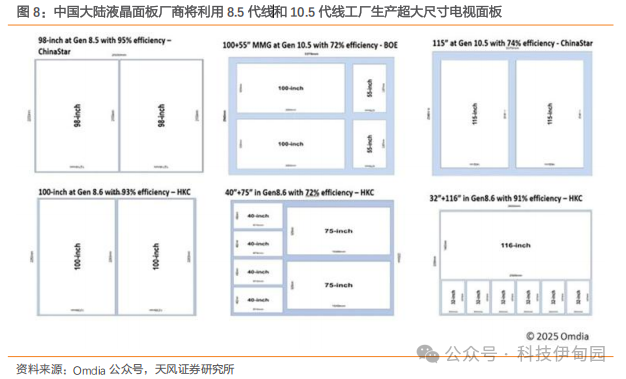 10.5代产线产能瓶颈明显,10.5代和8.5/8.6代产线的产品组合转变。面板厂商正在将越来越多的32英寸、43英寸、55英寸甚至包括65英寸面板生产从10.5代产线生产转移到8.5代和8.6代产线。8.5代和8.6代产线则集中于生产许多包含85英寸和86英寸面板的MM。中国大陆液晶面板厂商显著地调整了其产品组合,特别是京东方和华星光电。