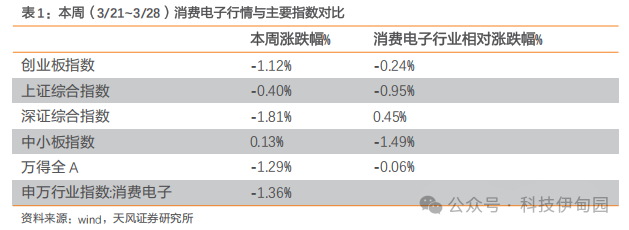 本周(3/21~3/28)消费电子行情落后主要指数。本周(3/21~3/28)上证综合指数下跌0.40%,同期创业板指数下跌1.12%,深证综指下跌1.81%,中小板指数上涨0.13%,申万消费电子行业指数下跌1.36%。
