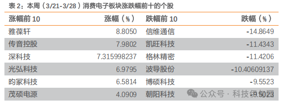 本周(3/21~3/28)消费电子板块涨幅前10的个股为:雅葆轩/传音控股/深科技/光弘科技/昀冢科技/茂硕电源/东尼电子(维权)/隆扬电子/精研科技/统联精密。