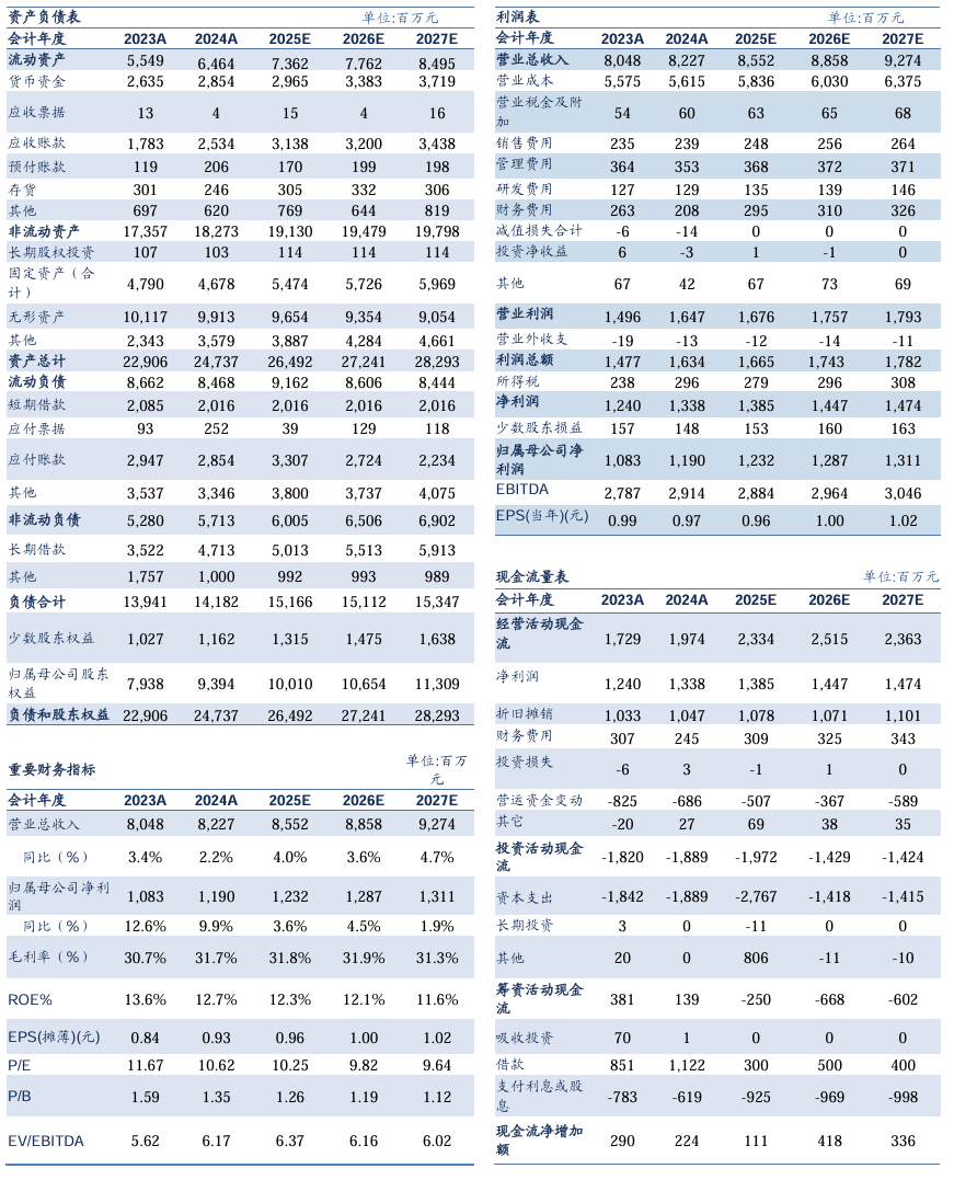 稳健经营属性突出,自由现金流进一步扩充。2024年公司经营活动现金流净额为19.74亿元,同比增长14.19%;投资活动现金流净额为18.9亿元,同比下降3.79%,伴随公司主业在建工程的陆续投运,公司自由现金流有望进一步向好,分红能力持续提高。2024年公司拟现金分红5.96亿元,分红比例为50.07%,按4月14日的股价计算,股息率为4.66%。