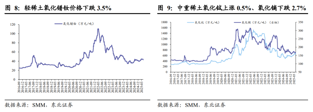 稀土:本周,轻稀土方面,氧化镨钕价格下跌3.5 %至41.60万元/吨;中重稀土方面,氧化铽价格上涨0.5%至716万元/吨,氧化镝价格下跌2.7%至165万元/吨。