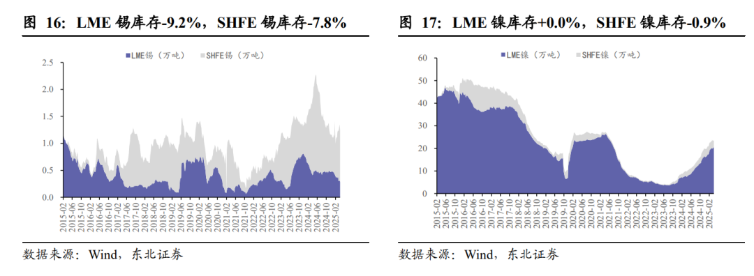 铜:铜价阶段性企稳,重视权益资产低位布局机遇。随着中美关税问题未再加码,特朗普亦已表达与中国达成协议的意向,关税交易暂告一段落,本周铜价走势阶段性企稳,LME铜上涨2.96%至9254美元/吨,SHFE铜上涨2.83%至7.59万元/吨,沪铜主力平值期权隐含波动率亦回落至16.39%的中位水平。短期看,关税交易暂告段落,基本面尚有支撑,关注后市宏观、基本面共振机遇:1)宏观交易层面,尽管宏观逻辑仍存在巨大不确定性,衰退仍是隐忧,但恐慌情绪已告一段落且市场对刺激政策有期待,或可继续交易情绪缓和。2)基本面层面,当前铜价已逐渐接近下游采购心理价位,①需求继续改善,开工环比上行,4/17当周精铜杆开工率78.07%,环比再上行3.31pct,SMM现货升水亦回升至130元/吨;②供给端扰动逐步兑现,精铜产量或边际下行:TC持续深跌后冶炼端减产风险加剧、贸易政策不确定性及内外价差拉大导致进口废铜下行,二季度电解铜产量或边际下行。4/17当周国内社会库存(含保税)降低3.69万吨至32.19万吨,库存或延续去化趋势。短期看铜价或阶段性企稳,上行幅度预计受限于关税谈判不确定性及衰退预期,铜的长期前景依然乐观,铜矿权益作为长久期资产具备低位布局性价比。相关标的:紫金矿业、洛阳钼业、西部矿业、江西铜业、金诚信、铜陵有色、五矿资源、中国黄金国际等。