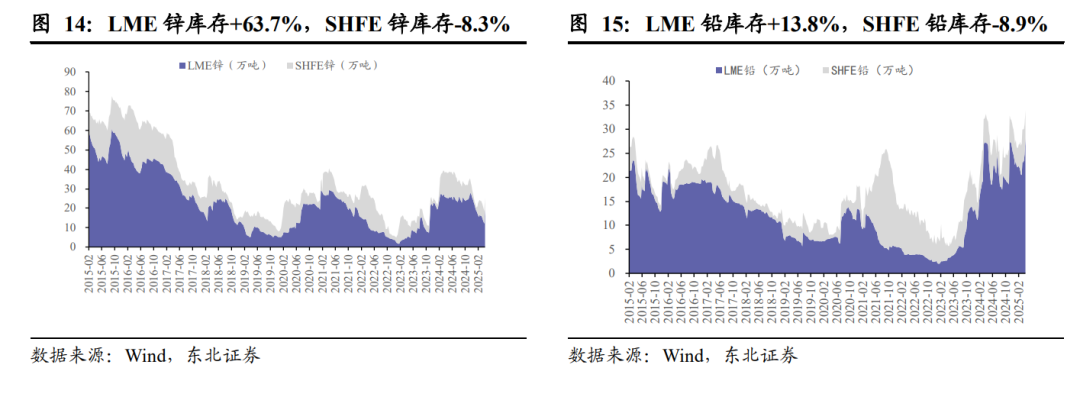 铝:氧化铝价格继续下探,电解铝社库去化加速。1)氧化铝仍处下行趋势:本周内氧化铝现货价暂稳,SMM氧化铝指数仍在2870元/吨附近波动。由于过剩预期难改及矿石报价下行,期货价格对检修、矿石扰动脱敏进一步下跌,主力合约跌至2814元/吨。尽管短期内盘面价格致使大部分氧化铝产能亏损,供给端检修规模放大,但新增产能释放依然较快,氧化铝过剩格局预期未改,矿端利润仍有被挤压空间,氧化铝价格整体仍处于下行趋势之中。2)电解铝宏观压制暂告段落、基本面提供偏强支撑:随着宏观压制告一段落,现货基本面仍延续去库,铝价回稳,SHFE铝本周上涨1.15%至1.98万元/吨。①宏观层面,恐慌情绪或已暂告一段落。②电解铝基本面层面尚处于偏强格局:电解铝需求在传统旺季叠加光伏抢装、电网订单放量之下仍有较强韧性,而供给端运行产能偏刚性,截至4月17日铝锭社会库存周度去库5.5万吨至68.9万吨,去库节奏进一步加快。③电解铝行业利润可观:截至4/18,SMM电解铝行业利润为3275元/吨,较上周五上行239元/吨。中长期看国内电解铝产能天花板限制供给弹性,新能源、轻量化及铝替代等因素下铝需求长期向好,铝行业有望维持高景气度。相关标的:中国铝业、天山铝业、云铝股份、神火股份、中国宏桥等。