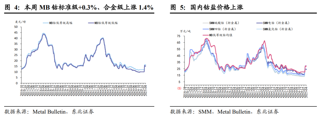 钴:本周,MB钴标准级均价本周上涨0.3%至15.93美元/磅,合金级均价本周上涨1.4%至20.15美元/磅;国内方面,电钴本周价格上涨2.6%至24.00万元/吨。钴盐方面,硫酸钴持平于4.94万元/吨,四氧化三钴持平于21.05万元/吨,氯化钴上涨0.2%至6.04万元/吨。