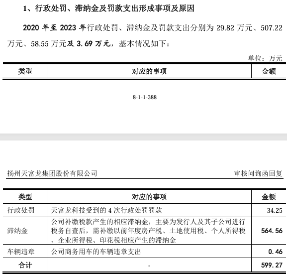 另外,2020年-2022年,天富龙还受到5次行政处罚。2020年至2023年,公司行政处罚、滞纳金及罚款支出分别为29.82万元、507.22万元、58.55万元及3.69万元。(港湾财经出品)