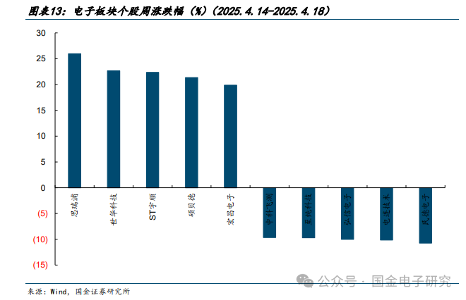 从个股情况来看,本周思瑞浦、世华科技、ST 宇顺、硕贝德、宏昌电子为涨幅前五大公司,涨幅分别为 25.98%、22.67%、22.37%、21.36%、19.89%。跌幅前五为民德电子、电连技术、弘信电子、至纯科技、中科飞测,跌幅分别为-10.73%、-10.12%、-10.00%、-9.68%、-9.63%。