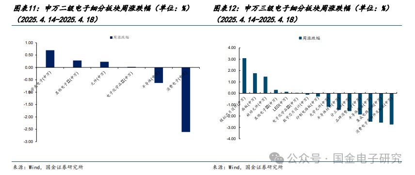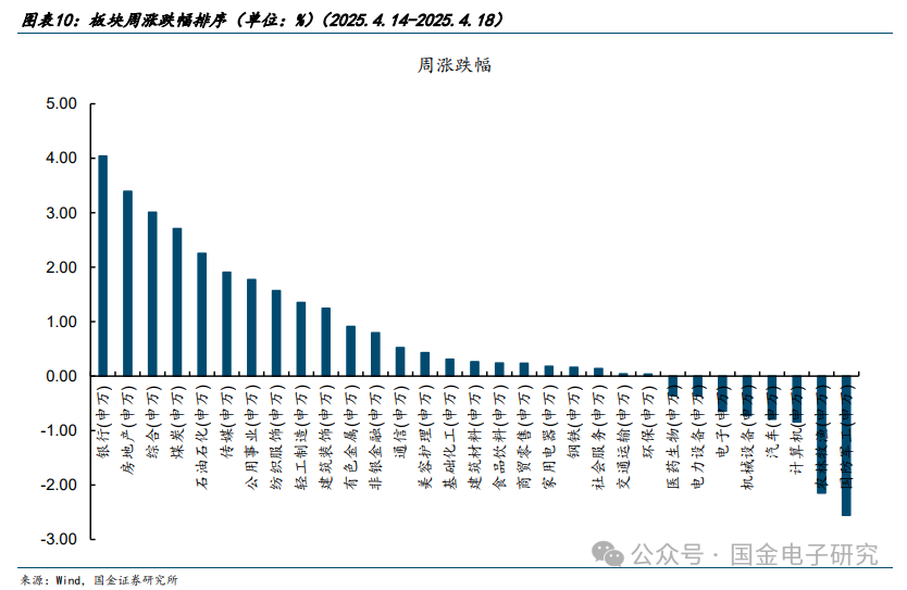 回顾本周行情,参考申万一级行业划分,涨跌幅前三名的行业分别为银行、房地产、综合,涨跌幅分别为 4.04%、3.40%、3.01%。涨跌幅后三位为国防军工、农林牧渔、计算机,涨跌幅分别为-2.55%、-2.15%、-0.84%。本周电子行业涨跌幅为-0.64%。
