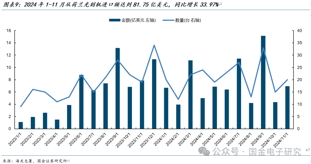 2024年1-11月中国从荷兰半导体设备进口金额同比大增,反映了国内半导体产业持续扩张。根据中国海关总署的最新数据,2024年1-11月,中国从荷兰的半导体设备进口额达到81.75亿美元,同比增长34%,进口光刻机台数共计228台,显示出国内半导体制造业对高端设备的强烈需求。光刻机已成功到位,看好后续其他主设备陆续招标。