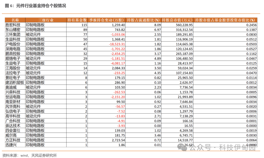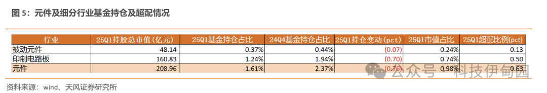 25Q1 元件行业持仓总市值超 200 亿,持仓占比略有下滑。其中被动元件/印刷电路板/元件行业整体基金持仓占比分别为0.37%/1.24%/1.61%,环比-0.07/-0.7/-0.76pct,对应超配比例分别为0.13/0.5/0.63pct。