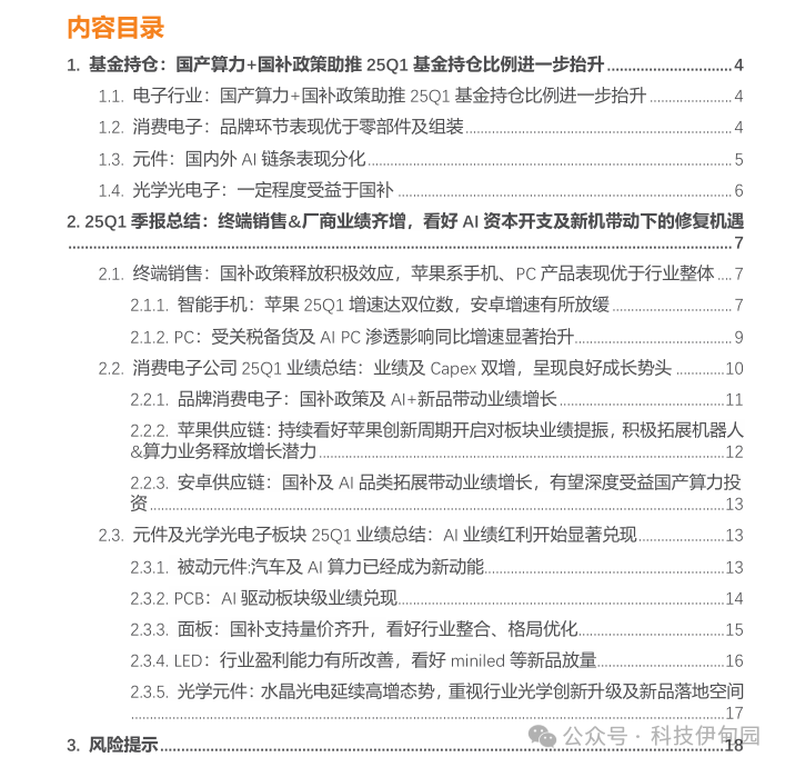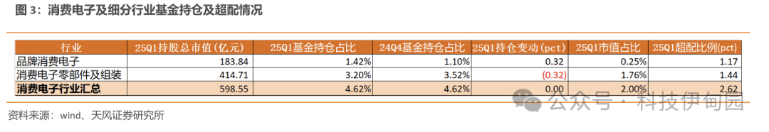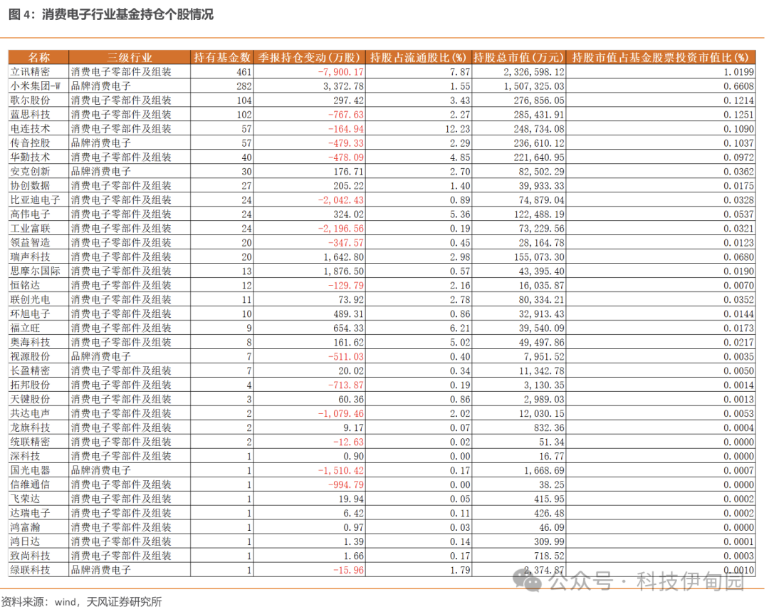 25Q1 基金持仓排名前 20 的消费电子个股依次为立讯精密、小米集团-W、歌尔股份、蓝思科技、电连技术、传音控股、华勤技术、安克创新、协创数据、比亚迪电子、高伟电子、工业富联、领益智造、瑞声科技、思摩尔国际、恒铭达、联创光电、环旭电子、福立旺、奥海科技。其中小米集团-W、歌尔股份、安克创新、协创数据和高伟电子等持仓股数增加。