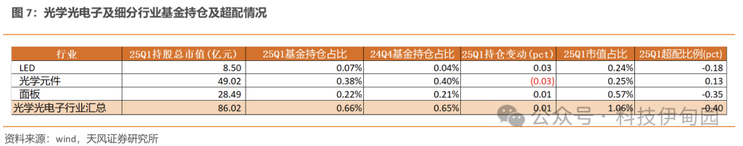 25Q1 光学光电子行业持仓总市值超86亿,持仓占比相对稳定。其中光学光电子行业整体/LED/光学元件/面板基金持仓占比分别为 0.66%/0.07%/0.38%/0.22%,环比+0.01/0.03/0.03/+0.01pct,对应超配比例分别为-0.4/-0.18/0.13/-0.35pct。