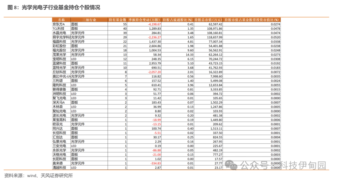 25Q1 基金持仓排名前10的光学光电子个股依次为京东方A、TCL科技、水晶光电、舜宇光学科技、福晶科技、彩虹股份、福光股份、茂莱光学、宝明科技、蓝黛科技。其中TCL科技、水晶光电、福晶科技、彩虹股份、福光股份等持仓股数显著增加。