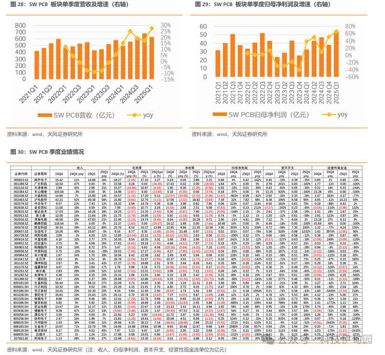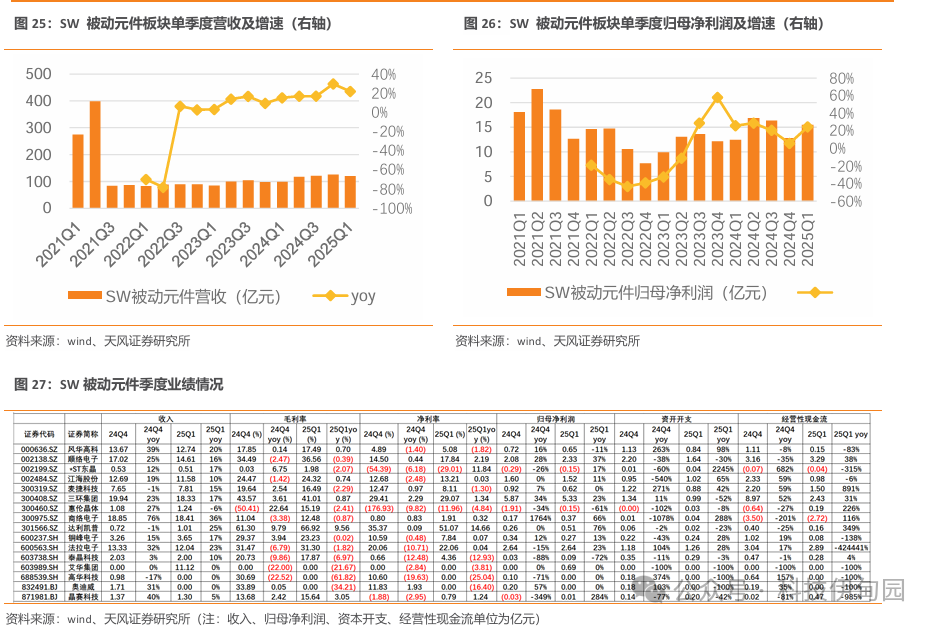 MLCC/电感被动元件行业在汽车、AI算力等新产品、新客户带动下保持较高增长动能。 25Q1 SW 被动元件板块实现收入116.84亿,同比+19%,实现利润15.03亿,同比增长21%,增长提速。