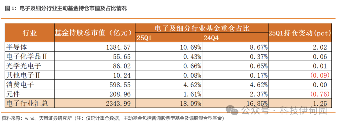 25Q1 电子行业基金持仓总市值约2344亿,占比18.09%,环比24Q4提升1.25pct,细分板块中半导体持仓占比显著提升,消费电子保持稳定,元件板块有小幅下降。其中半导体/ 电子化学品/光学光电子/其他电子/消费电子/元件持仓占比分别达到10.69%/0.43%/0.66%/0.08%/4.62%/1.61%,环比提升 2.02/0.06/0.01/-0.09/0/-0.76pct。基金统计范围为以主动基金为主,包括普通股票型基金及偏股混合型基金,相关持仓为重仓持股数据(下同)。