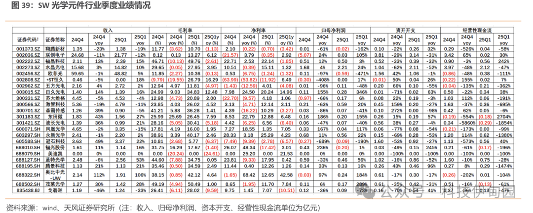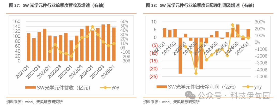 25Q1SW 光学元件板块实现收入126.3亿,同比+3%,实现归母净利润4.9亿,同比+42%。水晶光电2025 年一季度公司实现营业收入14.82亿元,同比增长10.20%,实现归母净利润 2.21亿元,同比增长23.67%,实现毛利率27.95%,较去年同期提升3.95%,一季度公司依旧维持了去年公司利润增速大于收入增速的良好态势,体现了公司的高质量成长。目前公司已积极构建了以消费电子为支柱的第一成长曲线,以车载光学为突破的第二成长曲线,以及以AR/VR为前瞻的第三成长曲线的业务版图。
